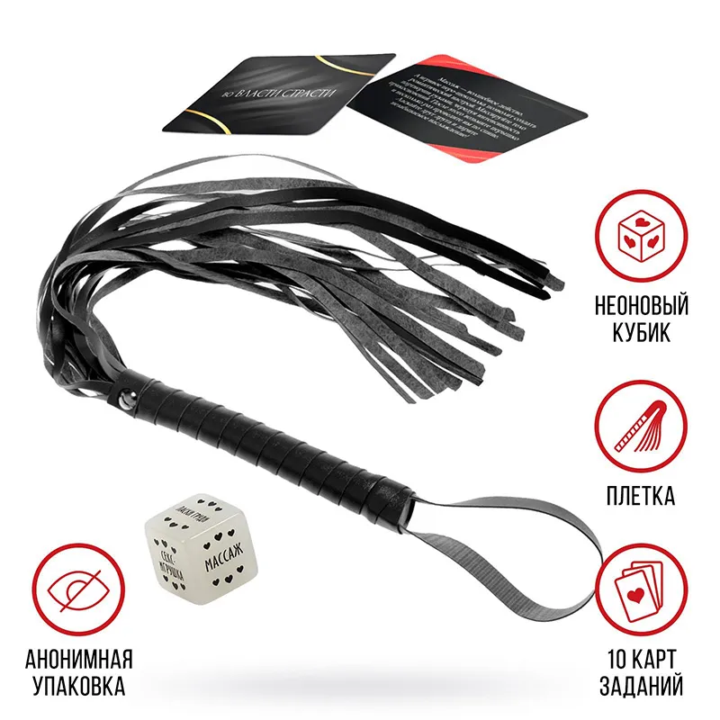 Как использовать? Внутри вас ждёт 10 карт с ролевыми играми. Внимательно их изучите, и выберите игру, которую будете использовать сегодня. По желанию можно подготовить костюмы и реквизит, чтобы обеспечить полное погружение. Осталось только подарить друг другу незабываемые эмоции! В комплекте есть плётка, которую можно использовать, чтобы добавить перчинки.