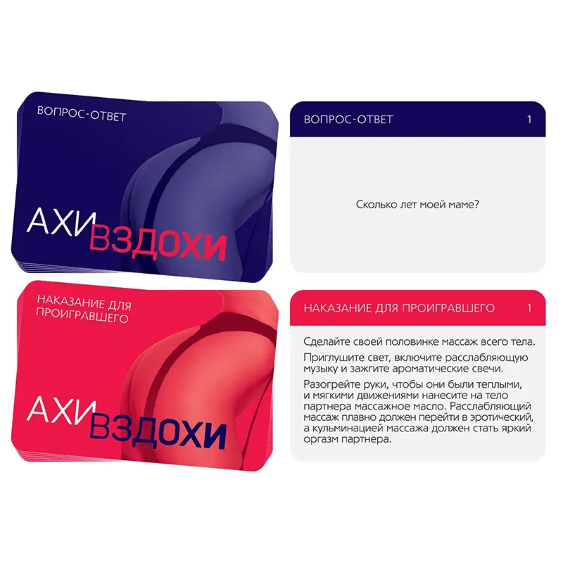 Окажитесь во власти безумной страсти «Ахи-вздохи» — это серия эротических игр для двоих, которая включает невероятное множество пикантных заданий-фантов для него и для неё. Здесь найдутся игры в формате вопрос-ответ, ролевые развлечения и необычные позы для секса.