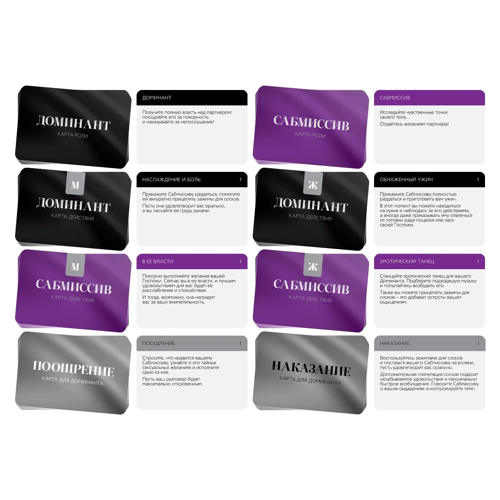 Хотите испытать новые эмоции? С этой игрой наказания будут более возбуждающими, а карты ролей помогут создать интригующую атмосферу. Вам нужно лишь расслабиться и полностью погрузиться в процесс. Подпишите договор о неразглашении и выберите желаемую роль. Один из вас будет доминирующим (доминантом), а другой — подчиняющимся (сабмиссивом). В комплекте есть карты наказаний для подчиняющегося, который ослушался своего хозяина. Доминирующий в любом порядке вытягивает карты из колоды наказания и следует инструкциям.