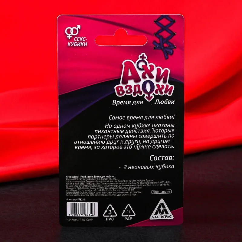 Возьмите эти кубики с собой в спальню, погасите свет и начинайте игру! В игре два кубика. На одном из них указаны пикантные действия, которые партнёры должны совершить по отношению друг к другу, а на другом — время, за которое это нужно сделать. Просто бросьте кубики и испытайте новые грани наслаждения!