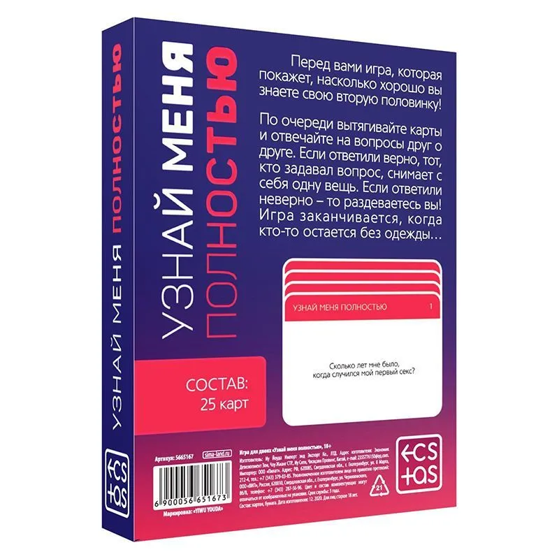 Игра покажет, как хорошо вы знаете свою вторую половинку! 25 карточек с очень интересными вопросам, на которые вы даёте друг другу откровенные ответы, постепенно узнаёте друг друга и возможно пламя страсти охватит вас обоих и не даст доиграть до конца!