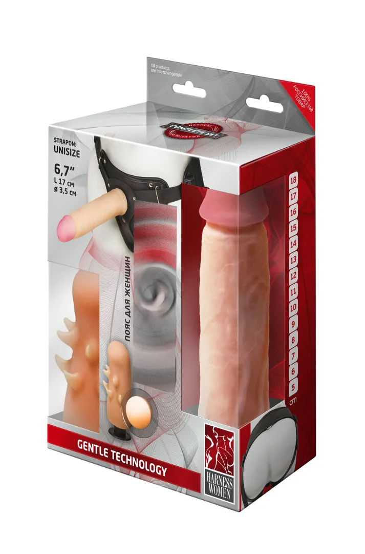 Harness-пояс для девушек. В комплект входят пояс-трусики и пара насадок. Это - отличная альтернатива для двухголовых фаллоимитаторов. Конструкция трусиков такова, что позволяет использовать абсолютно любые насадки, которые легко крепятся при помощи штырьков, входящих в комплект. Внутренняя поверхность трусиков мягкая, не имеет швов, легко регулирутся по размеру - что немаловажно. Два отверстия: одно внешнее - для любых насадок, на которые только способна ваша фантазия, второе - внутреннее, для вагинального проникновения хозяйки трусиков. В данном комплекте две насадки разных размера и формы. Фаллоимитатор в виде члена с ярковыраженной головкой длиной 19,5 см и диаметром 3,8 см выполнен из мягкой Киберкожи. Вторая насадка имеет эргономичную компактную форму, идеально подходящуюю для роли вагинального отростка: немного загнутую головку и гладкую поверхность. Длина - 12,8 см, диаметр - 3,8 см. Упаковка- картонная коробка.Мини вибропуля в подарок (вкладывается в трусики).