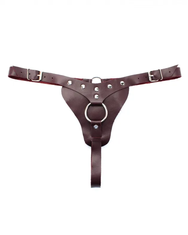 Трусики выполнены из натуральной кожи бордового цвета. Спереди находится металлическое кольцо для страпона. Изделие фиксируется ремнями и пряжками, позволяющими подобрать нужный размер. Сочный и дерзкий аксессуар поможет воплотить задуманное в реальность!