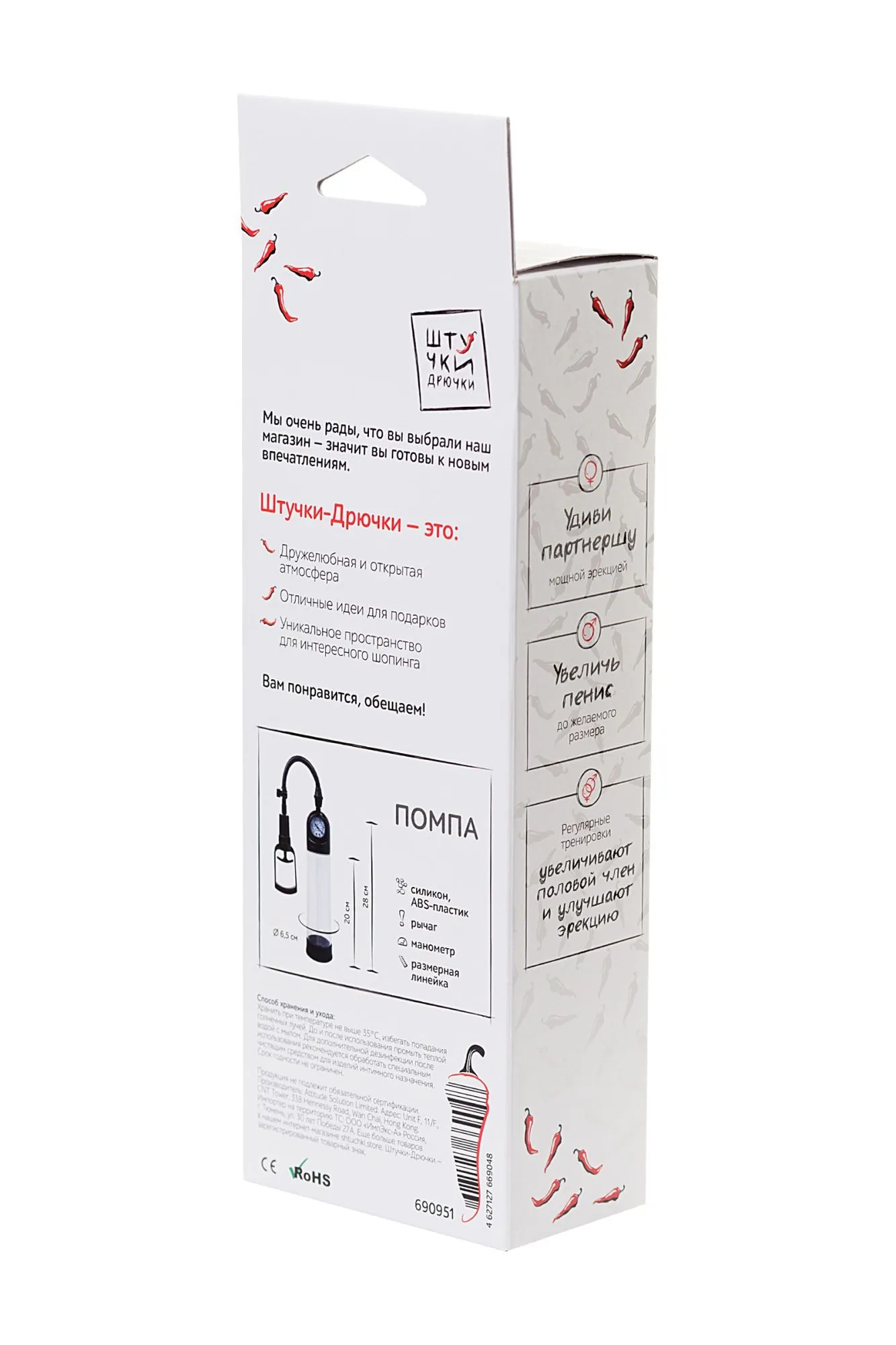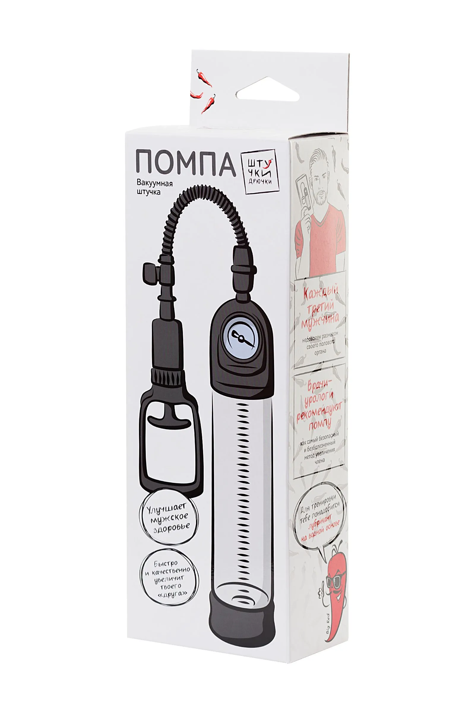 Ищешь простой, удобный, а главное безопасный способ прокачать свой «инструмент»? Тогда ты по адресу. Я — вакуумная помпа с манометром "Штучки-Дрючки", гуру в улучшении мужского здоровья. · Улучшается кровоснабжение и предотвращаются застои в сосудах, что продлевает боеготовность мужчины. · Мышцы становятся более эластичными и выносливыми. · Значительно увеличивается размер пениса (на один половой акт при единоразовом использовании, на длительное время при регулярных тренировках). Приятные дополнения: · манометр и удобный рычаг для откачки воздуха позволяют легко контролировать процесс тренировки и нагрузки; · результат тренировок очень просто отслеживается с помощью линейки на колбе. Пора покорить сексуальный Олимп!