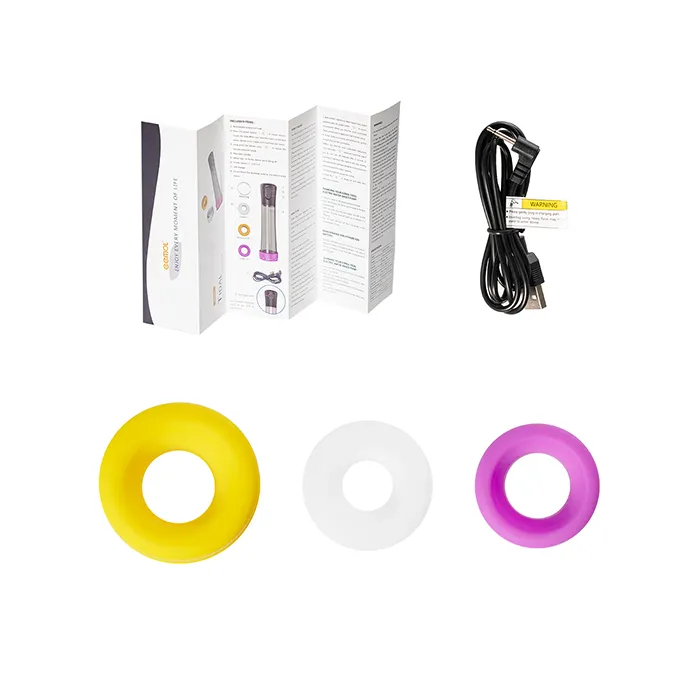 В комплекте имеется три силиконовых кольца-уплотнителя разного диаметра и провод для зарядки.