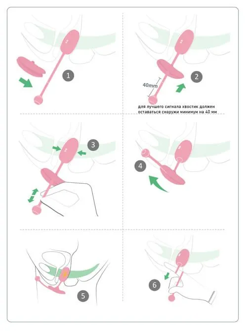 Используйте с лубрикантами только на водной основе. Включите девайс. Аккуратно введите тренажер во влагалище, оставив хвостик снаружи минимум на 4 см. С помощью приложения, тренируйтесь, поочередно сжимая и расслабляя мышцы влагалища. После тренировки извлеките шарик за хвостик.