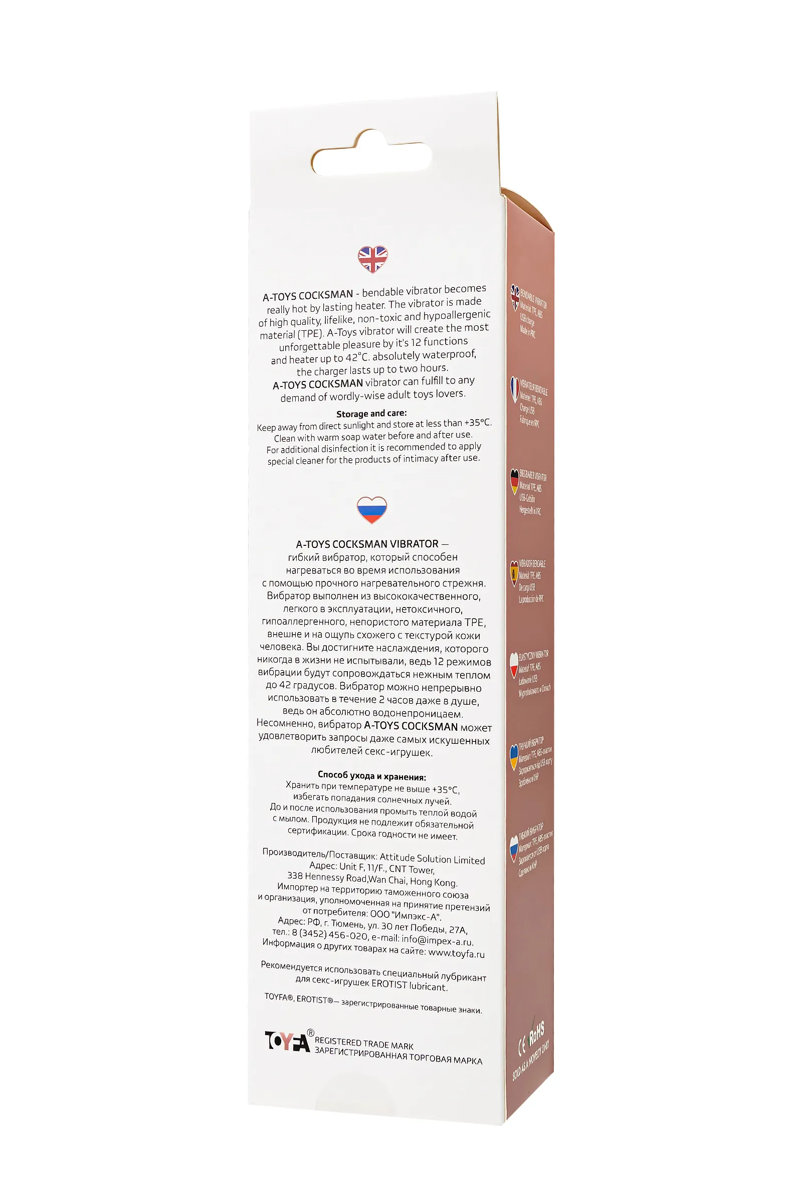ВНИМАНИЕ! НА УПАКОВКЕ ВОЗМОЖНО НАЛИЧИЕ ПЯТЕН. A-Toys Cocksman — гибкий вибратор, который способен нагреваться во время использования с помощью прочного нагревательного нагревательного элемента, расположенного в головке игрушки. Вибратор выполнен из высококачественного, легкого в эксплуатации, нетоксичного, гипоаллергенного, непористого материала TPE, внешне и на ощупь схожего с текстурой кожи человека. Вы достигните наслаждения, которого никогда в жизни не испытывали, ведь 12 режимов вибрации будут сопровождаться нежным теплом до 42 градусов. Время нагрева составляет 2-3 минуты. Вибратор можно непрерывно использовать в течение 2 часов. Несомненно, вибратор A-Toys Hot может удовлетворить запросы даже самых искушенных любителей секс-игрушек. Рабочая длина 20,5 см.