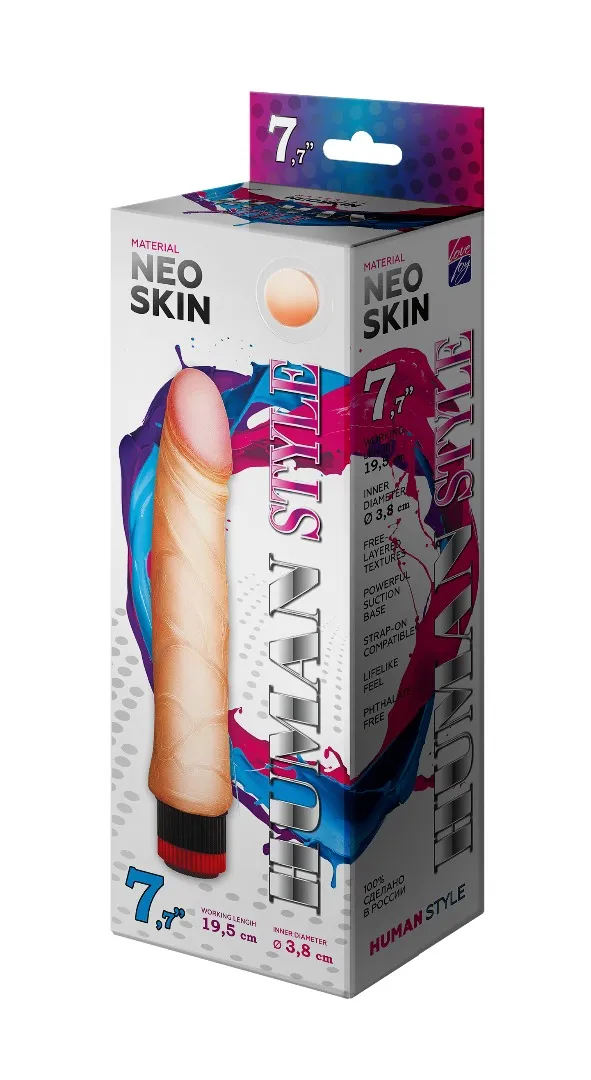 Реалистичный вибромассажер телесного цвета. Имеет форму члена с ярковыраженной головкой. Необычайно приятный, рельефный, выполненный из материала «Неоскин» , передающий эффект мягкой реалистичной текстуры кожи, не имеет швов. Характеристика: общая длина– 23 см, рабочая длина- 19,5 см, максимальный диаметр- 3,8 см, работает от 2АА батареек (нет в комплекте). Упаковка- картонная коробка с принтом.