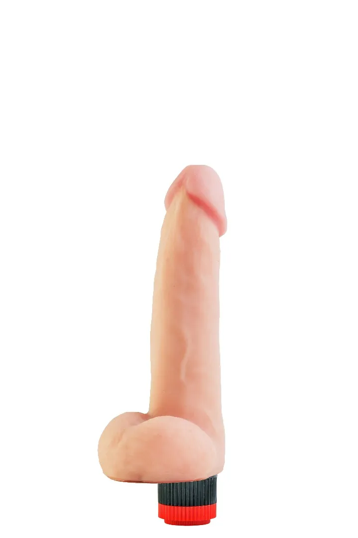 Вибратор-реалистик телесного цвета. Имеет форму члена с ярко-выраженной головкой и мошонкой, рельефный, выполненный из материала неоскин, не имеет швов. Скорость вибрации регулируется кнопкой у основания изделия. Общая длина – 22,5 см, рабочая длина-16 см, максимальный диаметр -4,5 см,без запаха, упакован в пленку