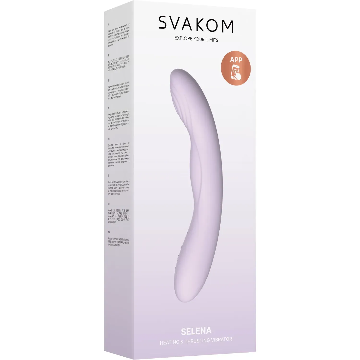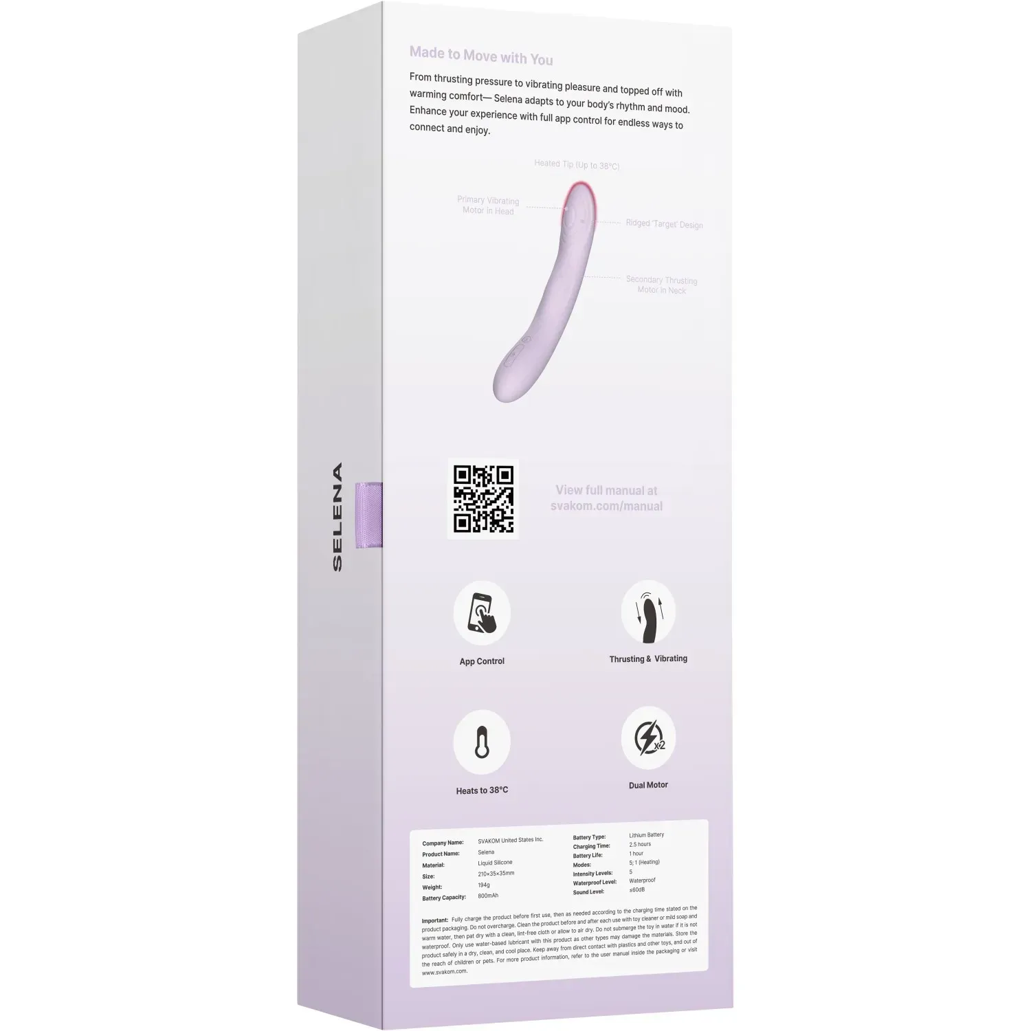 Дополнительные преимущества: В комплект входит USB-зарядка. Selena полностью водостойка, что добавляет удобства и возможностей для использования в различных условиях. Возможность управления через приложения SVAKOM и KooSync.