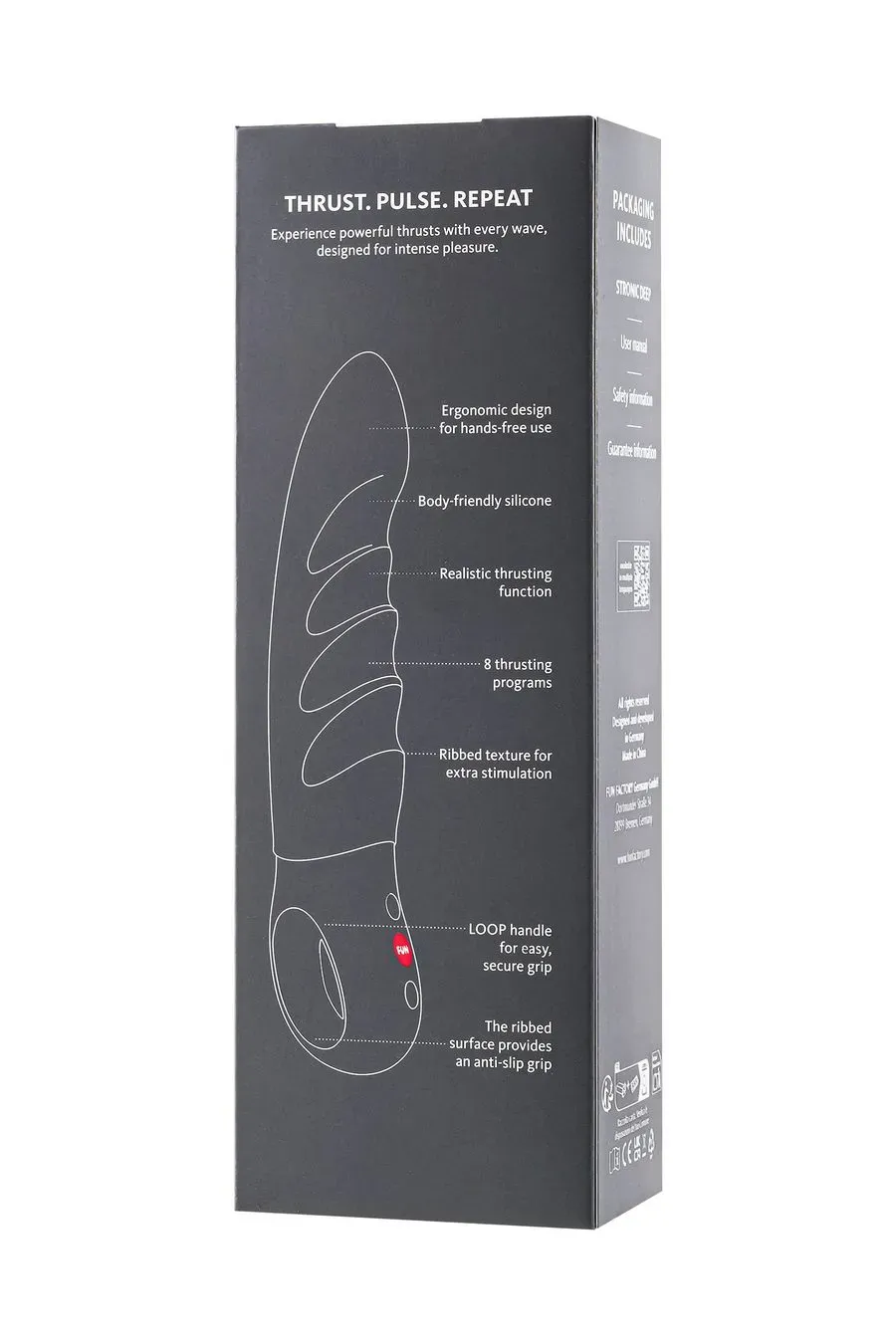 С 4 уровнями скорости и 4 режимами поступательных движений этот пульсатор нагнетает предвкушение волна за волной. Эргономичная ручка LOOP с ребристой нескользящей текстурой и интуитивно понятным 3-кнопочным управлением обеспечивает надежный захват и удобную навигацию. Изготовленный из приятного для тела силикона, заряжается через USB-C и полностью водонепроницаем (IPX7), STRONIC DEEP всегда готов к вашему следующему приключению. Хотите поднять ощущения на новый уровень? Всегда используйте смазку на водной основе!