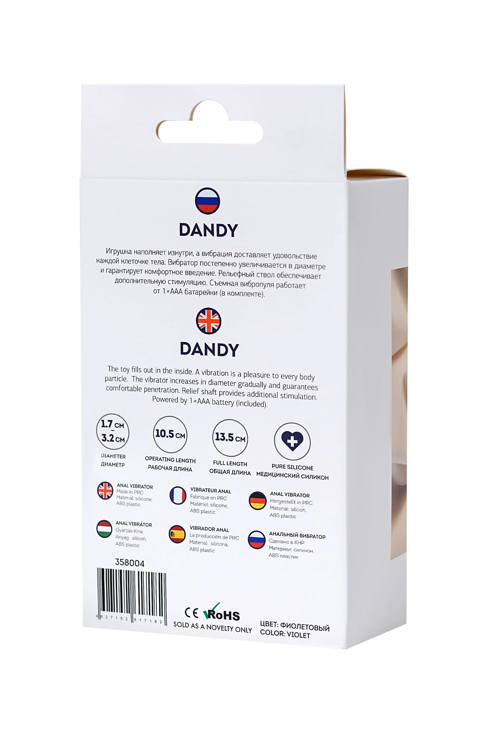 Dandy Игрушка наполняет изнутри, а вибрация доставляет удовольствие каждой клеточке тела. Вибратор постепенно увеличивается в диаметре и гарантирует комфортное введение. Рельефный ствол обеспечивает дополнительную стимуляцию. Съемная вибропуля работает от 1×ААА батарейки (в комплекте).