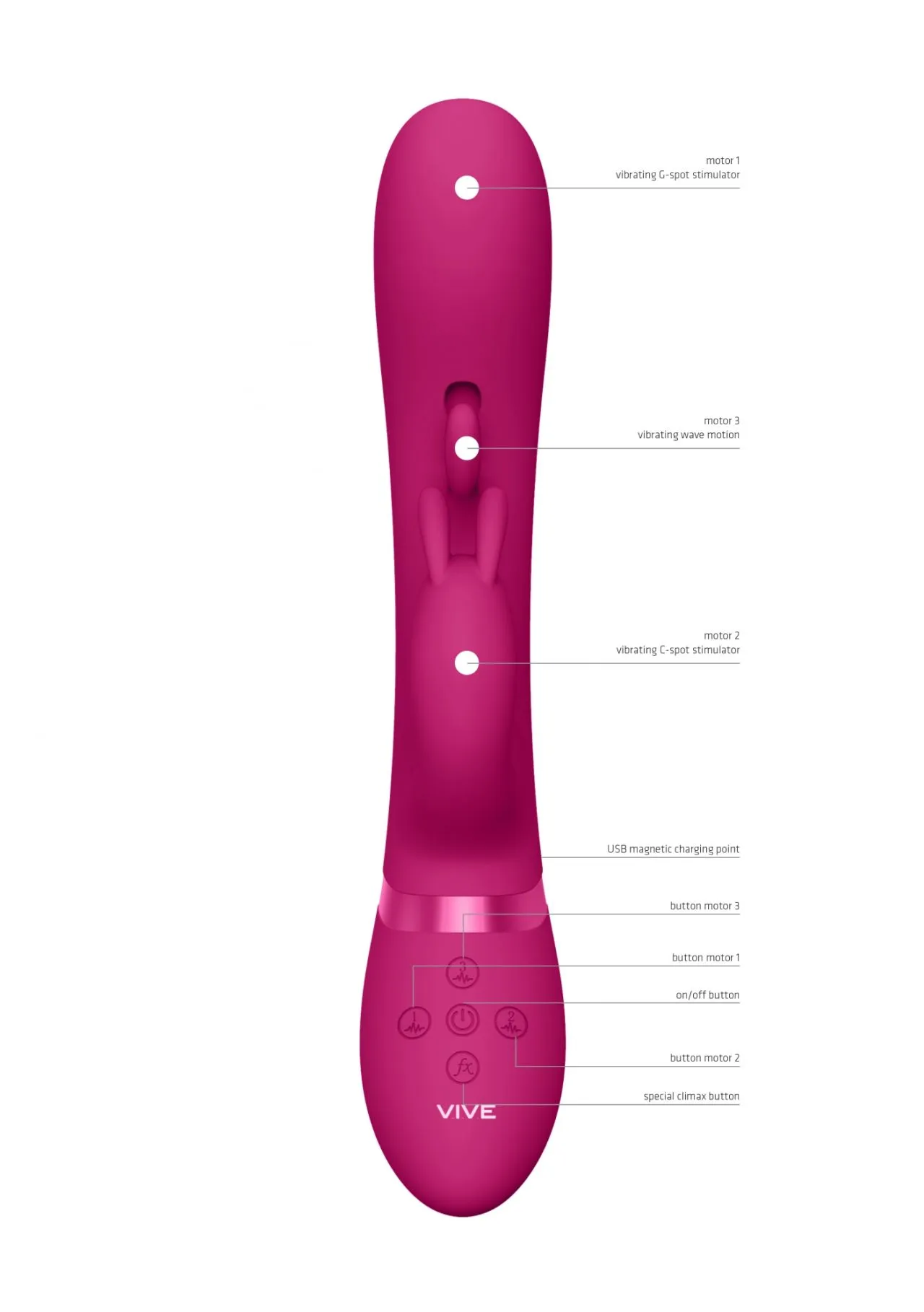 Изготовлено изделие из шелковистого медицинского (гипоаллергенного) силикона и как большинство моделей линейки VIVE имеет кнопку мгновенного оргазма, запуская все моторы на максимум одним касанием.