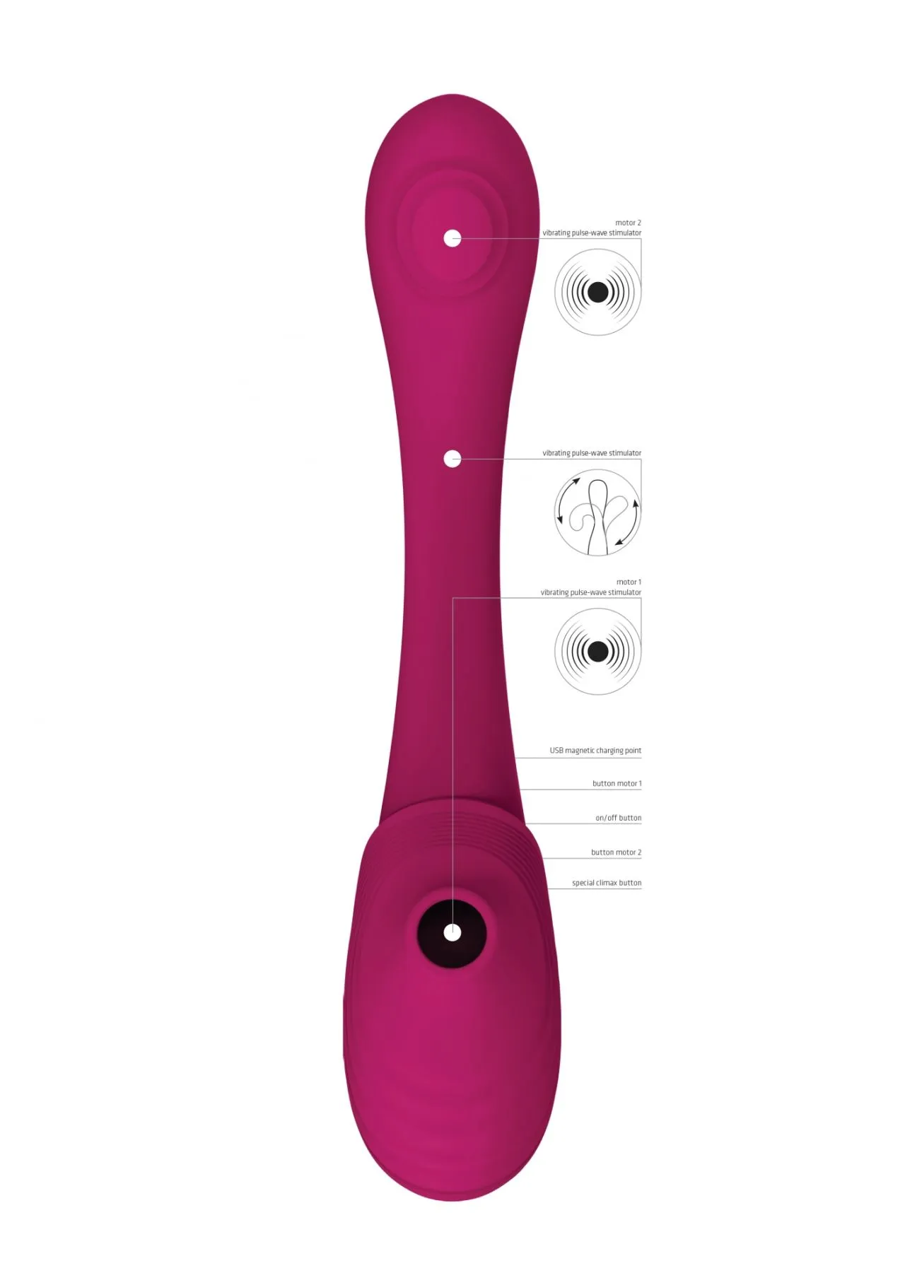 Оснащен 2-мя импульсно-волновыми моторами. Одна сторона вибратора может использоваться для бесконтактной импульсной стимуляции клитора, а другая для мощной стимуляции зоны G. Такой вибратор отлично подойдет и девушкам с повышенной чувствительностью и тем, кто хочет эту чувствительность пробудить.