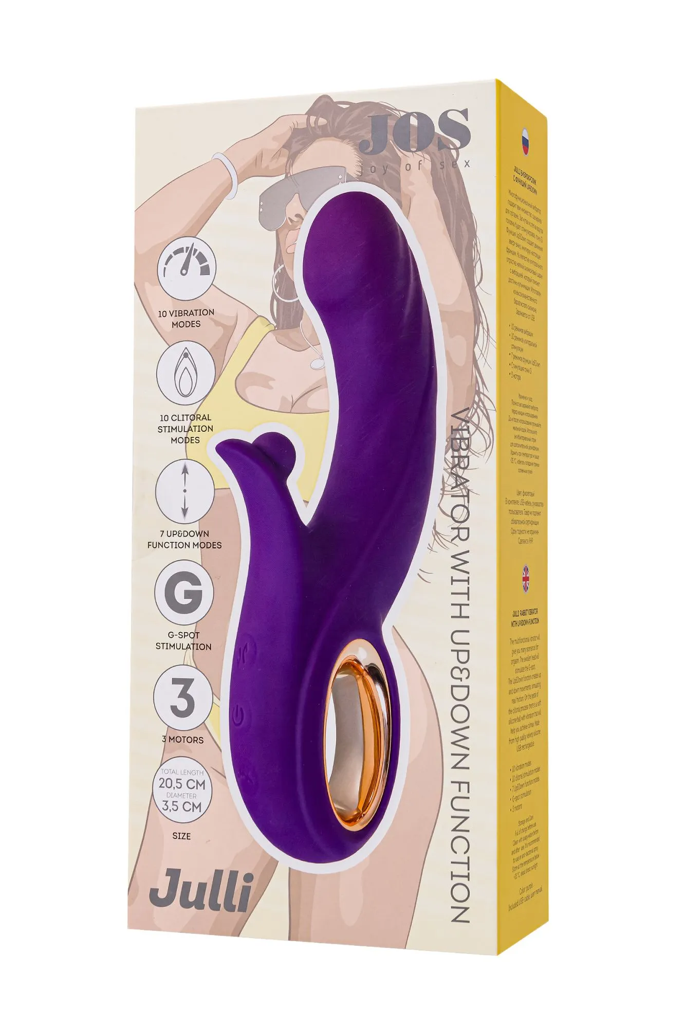 Многофункциональный вибратор JULLI с клиторальным стимулятором и функцией Up&Down от JOS предлагает вам бесчисленные сценарии для оргазма и незабываемого удовольствия! Изогнутая и слегка вздутая головка JULLI стимулирует точку G, принося вам мгновенные всплески блаженства. Функция Up&Down создает движения вверх-вниз, идеально имитируя настоящие фрикции и даря вам ощущение полного удовлетворения. На лепестке клиторального отростка мягкий силиконовый шарик с вибрацией будет ласкать ваш клитор, провожая вас к вершинам наслаждения! Выбирайте из 10 режимов вибрации, 10 режимов клиторальной стимуляции и 7 режимов функции Up&Down, чтобы создать идеальную комбинацию для вашего оргазма. С 3 моторами JULLI гарантированно доставит вам удовольствие и разнообразие в вашей интимной жизни. Дизайн игрушки выполнен в виде изогнутого кролика в насыщенном фиолетовом цвете с золотыми вставками, придавая ей шик и элегантность. С-образная округлая головка погружного ствола имеет диаметр 3,5 см, а рабочая длина кролика составляет 10,5 см. Интуитивно понятная панель управления с тремя кнопками делает использование JULLI простым и удобным. Эргономичная ручка-кольцо добавляет комфорта в использование. Изготовленный из высококачественного бархатистого силикона, JAMMY легко заряжается от USB, что делает его современным и практичным в использовании. Идеально гладкое и безопасное покрытие обеспечит вашей коже комфорт. Позаботьтесь о правильном хранении и уходе за JAMMY, чтобы он всегда оставался вашим верным спутником в мире наслаждения. Используйте только водные лубриканты. После каждого использования промойте его мыльной водой и дезинфицируйте антибактериальным спреем, чтобы сохранить его гигиеничность и продлить его срок службы. Технические характеристики: 10 режимов вибрации 10 режимов клиторальной стимуляции 7 режимов функции Up&Down 3 мотора Стимуляция точки G Общая длина 20,5 см Рабочая длина 10,5 см Диаметр 3,5 см Материал - силикон, ABS-пластик Цвет - фиолетовый