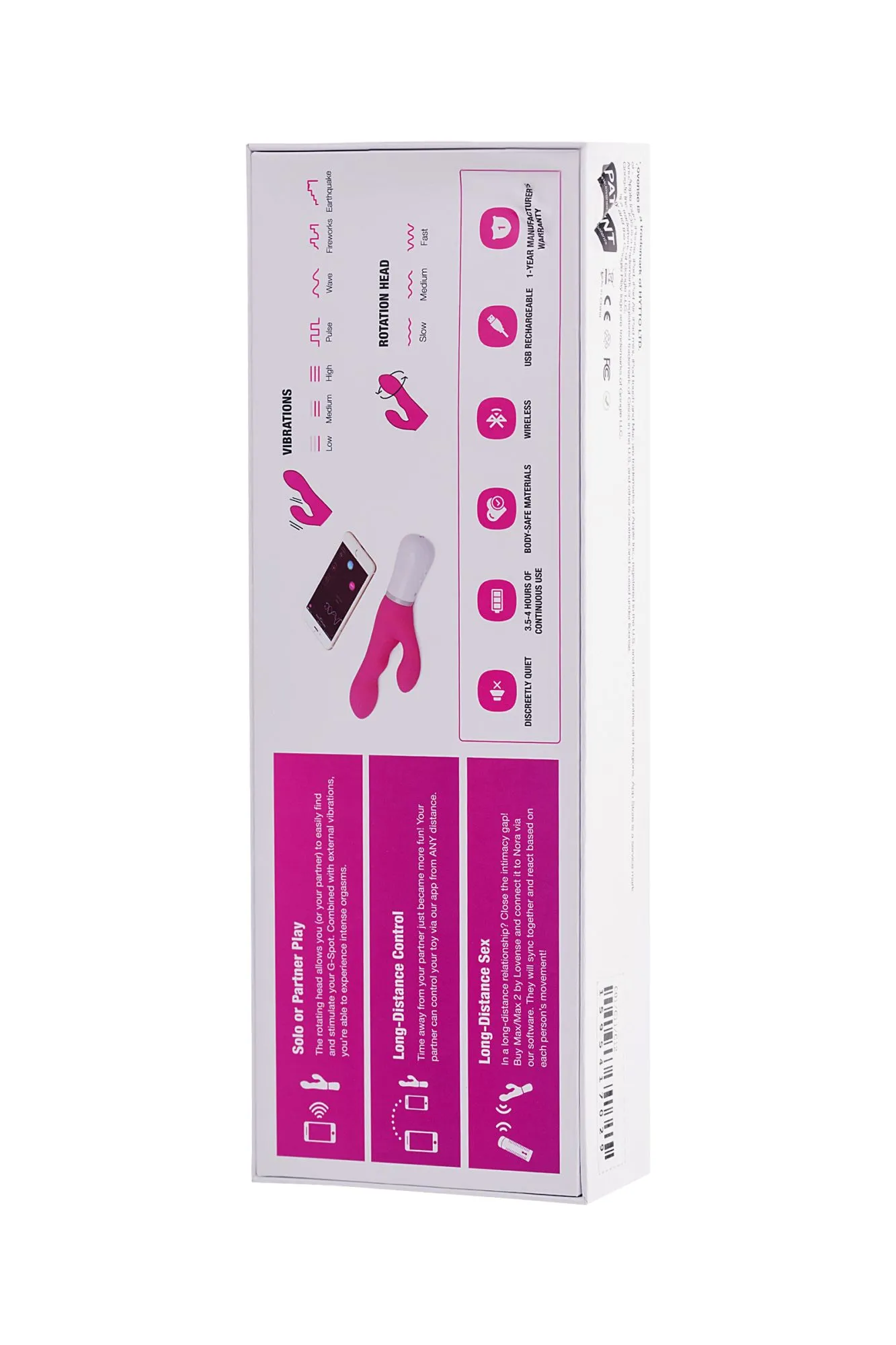 Откройте для себя удивительный мир наслаждения с вибратором-кроликом Nora от Lovense. Это самый мощный управляемый на расстоянии вибратор с двойной стимуляцией и функцией Bluetooth. Компания Lovense является одним из ведущих производителей секс-игрушек. Наслаждайтесь отдельным контролем над стимуляцией точки G и клитора, создавая неповторимые ощущения, которые удовлетворят ваши самые сокровенные желания. Nora обладает специально изогнутым стволом, который мягко стимулирует нужные точки, а глубокое вращение головки обеспечивает интенсивную стимуляцию точки G. Погружная часть вибратора - 12 см. Гибкая вибрирующая клиторальная лапка приспосабливается к разным типам телосложения, обеспечивая идеальное сочетание комфорта и удовольствия. Синхронизируйте Nora с другими игрушками Lovense, такими как Calor или Max 2, и наслаждайтесь интерактивным сексом на расстоянии. Управляйте игрушкой через приложение Lovense Remote, выбирая из неограниченного количества паттернов вибрации и синхронизируя ее с музыкой. Активируйте вибрацию звуком или настройте уровень мощности, исходя из своих индивидуальных предпочтений. отличное подключение в сочетании с множеством функций неограниченное количество паттернов управление с близкого расстояния библиотека с более чем 5000 паттернов синхронизация с музыкой. Nora выполнена из 100% безопасного для тела силикона, обладает шелковистой поверхностью – особенный комфорт в ваших руках. Яркий сочный розовый цвет – визитка игрушек от Lovense. С помощью магнитной USB-зарядки вы можете легко подзарядить игрушку, кроме того, вы устанете первой – длительное наслаждение без подзарядки до 245 минут! В режиме ожидания Nora сохраняет заряд до 120 часов! Освободите свои фантазии и насладитесь уникальным комфортом и стимуляцией с вибратором-кроликом Nora от Lovense. Управляйте на расстоянии, создавайте новые интимные связи и погружайтесь в мир бесконечного удовольствия. Что в комплекте: Вибратор-кролик Nora c Bluetooth USB кабель для подзарядки Руководство пользователя Сумка для хранения