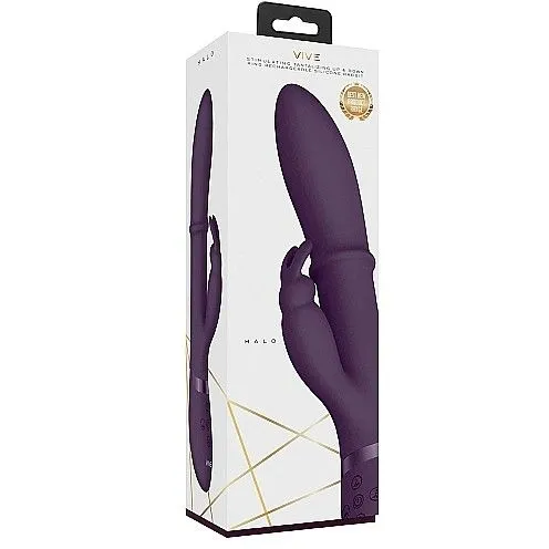 "Halo" – вибромассажер-кролик в классическом исполнении. Он изготовлен из высококачественного, мягкого, нежного на ощупь 100% медицинского силикона с пылеотталкивающими свойствами и прочного, элегантного АБС-пластика. Вибромассажер оснащен инновационными электродвигателями нового поколения. Преимущество такого типа двигателя в том, что он делает интенсивную стимуляцию очень мягкой даже при мощном максимальном воздействии.