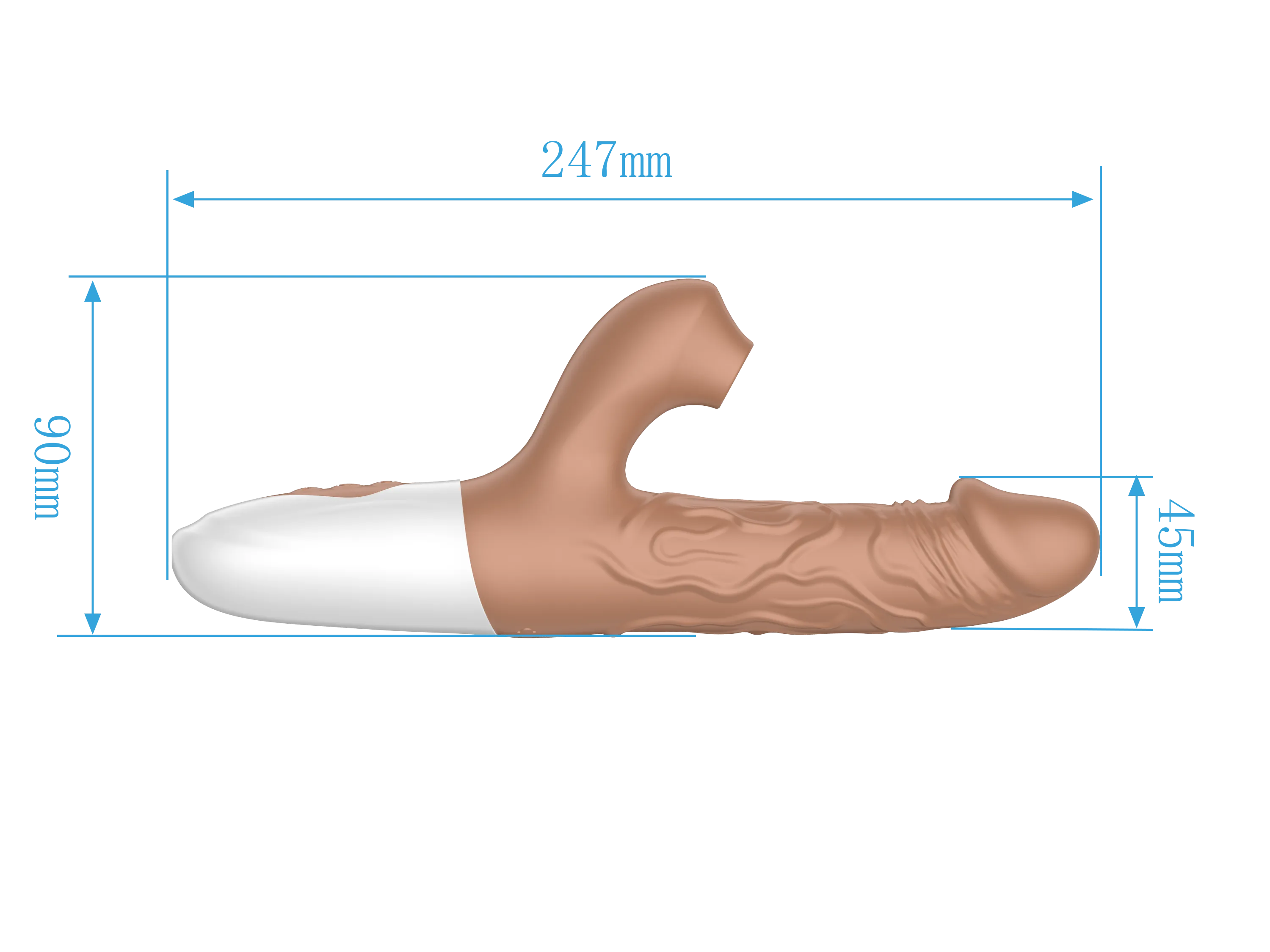 Вибратор-кролик в реалистичном дизайне в виде мужского пениса с текстурированными венами для большей стимуляции. Вибратор оснащен 10 режимами вибрации, 3 режимами пенетрации и 7 режимами сосания, что позволяет подобрать идеальную комбинацию для любого настроения. Изготовленный из мягкого и безопасного силикона с ABS-пластиком, вибратор приятен на ощупь и гипоаллергенен. Водонепроницаемость IPX7. Вес: 222 г., размеры: 225*90*40 мм. Длина клиторального отростка - 5см, ширина - 2,7см, диаметр раструба - 1,5см. Устройство оснащено перезаряжаемой литиевой батареей, которая обеспечивает до 45 минут работы. При этом уровень шума не превышает 50 дБ, гарантируя тихую и дискретную эксплуатацию.