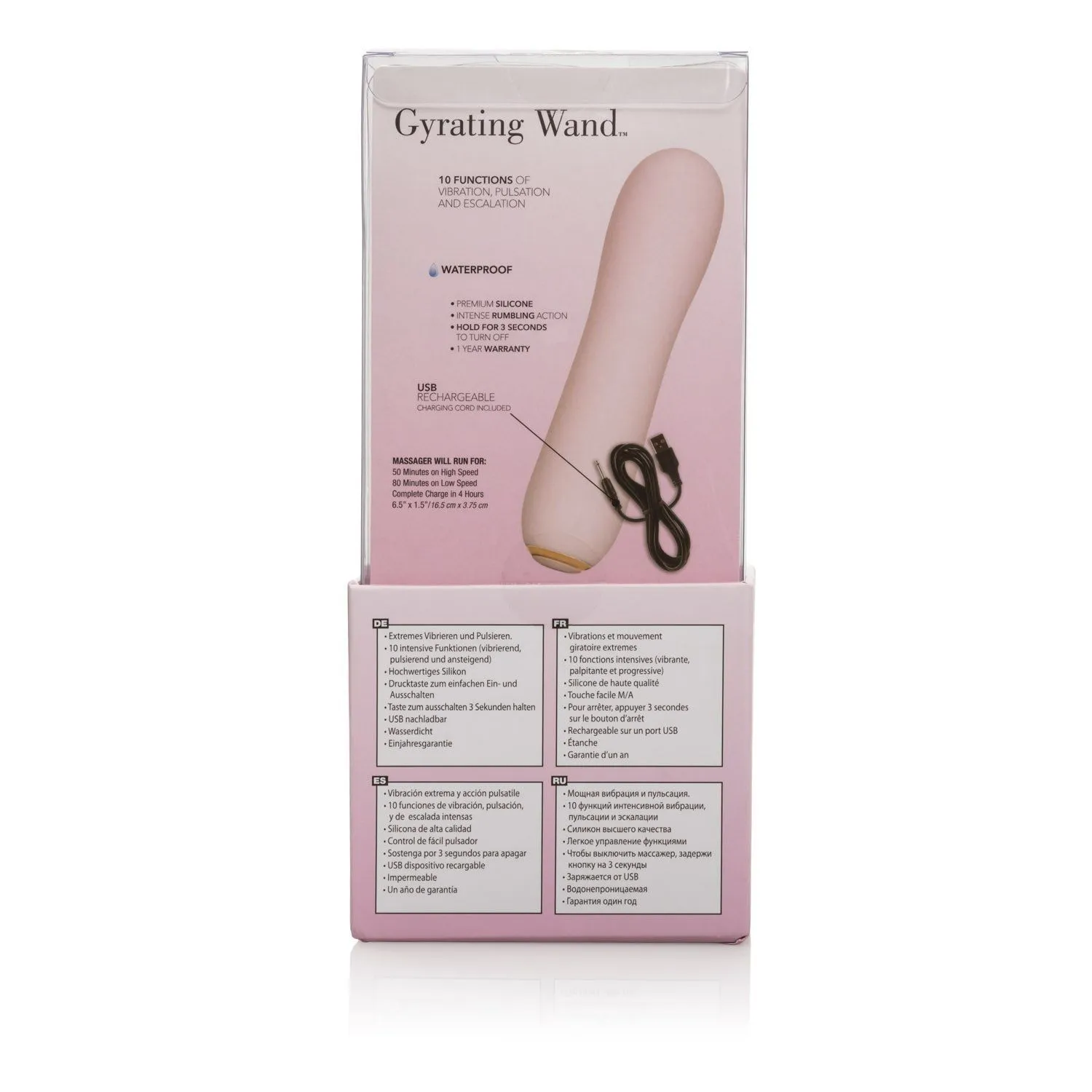 Вибратор сделан из премиум-силикона и оснащен перезаряжаемым аккумулятором, который заряжается с помощью USB кабеля. Полная зарядка происходит в течение 4 часов, а работает он в течение 50 минут на высокой мощности вибрации и 80 минут на низкой.