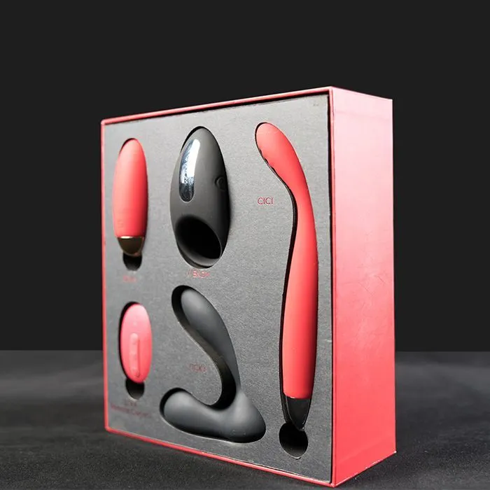Набор Gift Box for Lovers от компании Svakom состоит из интимных 4 игрушек: вибратора для точки G Cici, виброяйца на ду Elva, эрекционного виброкольца Wendy и стимулятора простаты Vicky. Этот набор включает в себя все необходимое для проведения с партнером ночи, полной любви и страсти.