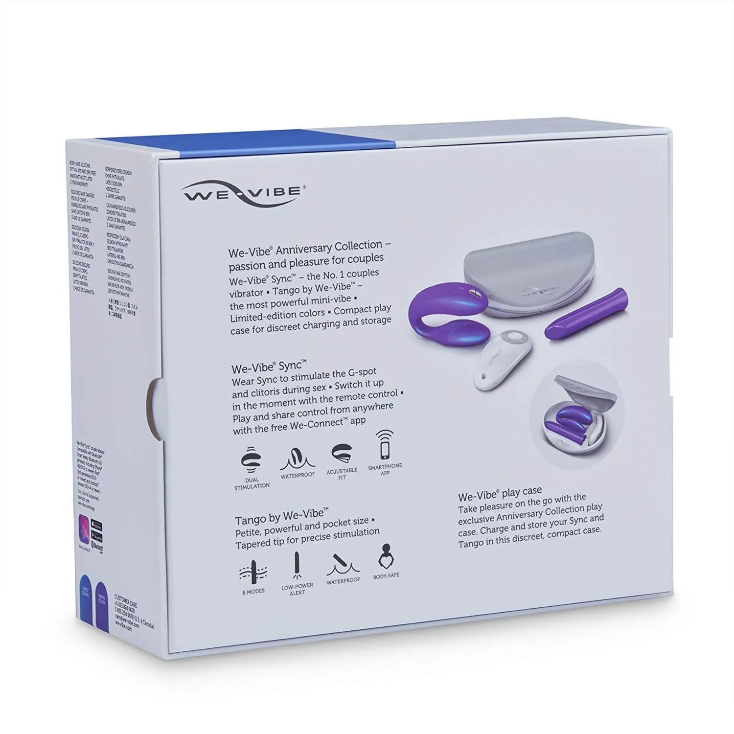 Набор вибраторов Anniversary collection от компании We-Vibe идеально подойдет тем парам, которые хотят разнообразить свою интимную жизнь. В комплект входят вибратор для пар Sync на ДУ, мини-вибратор Tango, а также стильный чехол для хранения, который одновременно с этим служит и базой для зарядки игрушек.