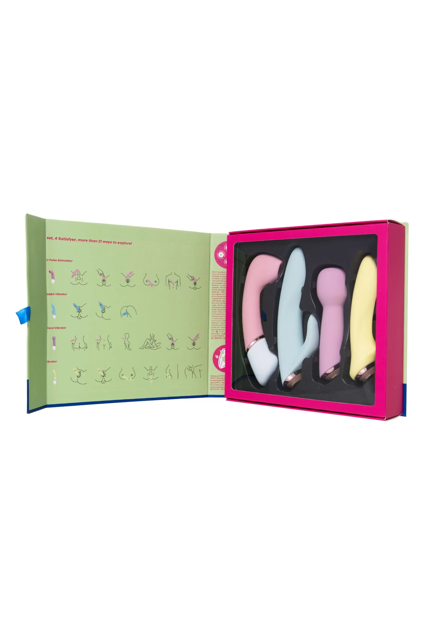 Fabulous Four – это фантастический набор из четырех топовых девайсов для сексуальных радостей: вакуум-волновой стимулятор с увеличенным раструбом, массажер-ванд, классический вибратор и вибратор-кролик. Великолепная четверка Fabulous Four от знаменитого бренда Satisfyer станет персональным проводником в мир удовольствия и наслаждения. С этим набором легко познавать возможности своего тела и партнера. Аккумулятор находится в основании, на котором фиксируются сменные насадки, каждая насадка имеет мощный мотор и 12 режимов вибрации. Вибратор-кролик с погружной длиной 12,5 см и диаметром 3,5 см с двумя моторами позволит ощутить всю прелесть стимуляции зоны G и клитора. Классический вибратор с рабочей длиной 11 см и массажер-ванд длиной 13 см обладают такой же глубокой проникающей вибрацией, способной расслаблять мышцы тела и снимать напряжение. Вакуум-волновой стимулятор имеет расширенный раструб, что позволяет стимулировать не только клиторальную зону, но и область сосков и головки полового члена. Fabulous Four предлагает попробовать вместе с партнером всевозможные виды стимуляции: клиторальную, вагинальную и анальную, а также массаж тела и эрогенных зон. Особенности: 4 сменные насадки с разнообразной стимуляцией для полного удовлетворения Простое управление кнопками на корпусе. Стильный современный дизайн в трендовых цветах. 12 режимов вибрации и 11 режимов волновой стимуляции. Нежный эластичный силикон без запаха, аллергенов и вредных для здоровья веществ. Инструкция с подсказками по применению на внутренней стороне упаковки. 100% водонепроницаемый - IPX7. Время работы 60 минут. Перезаряжаемый аккумулятор через USB-кабель, время зарядки 3 часа.