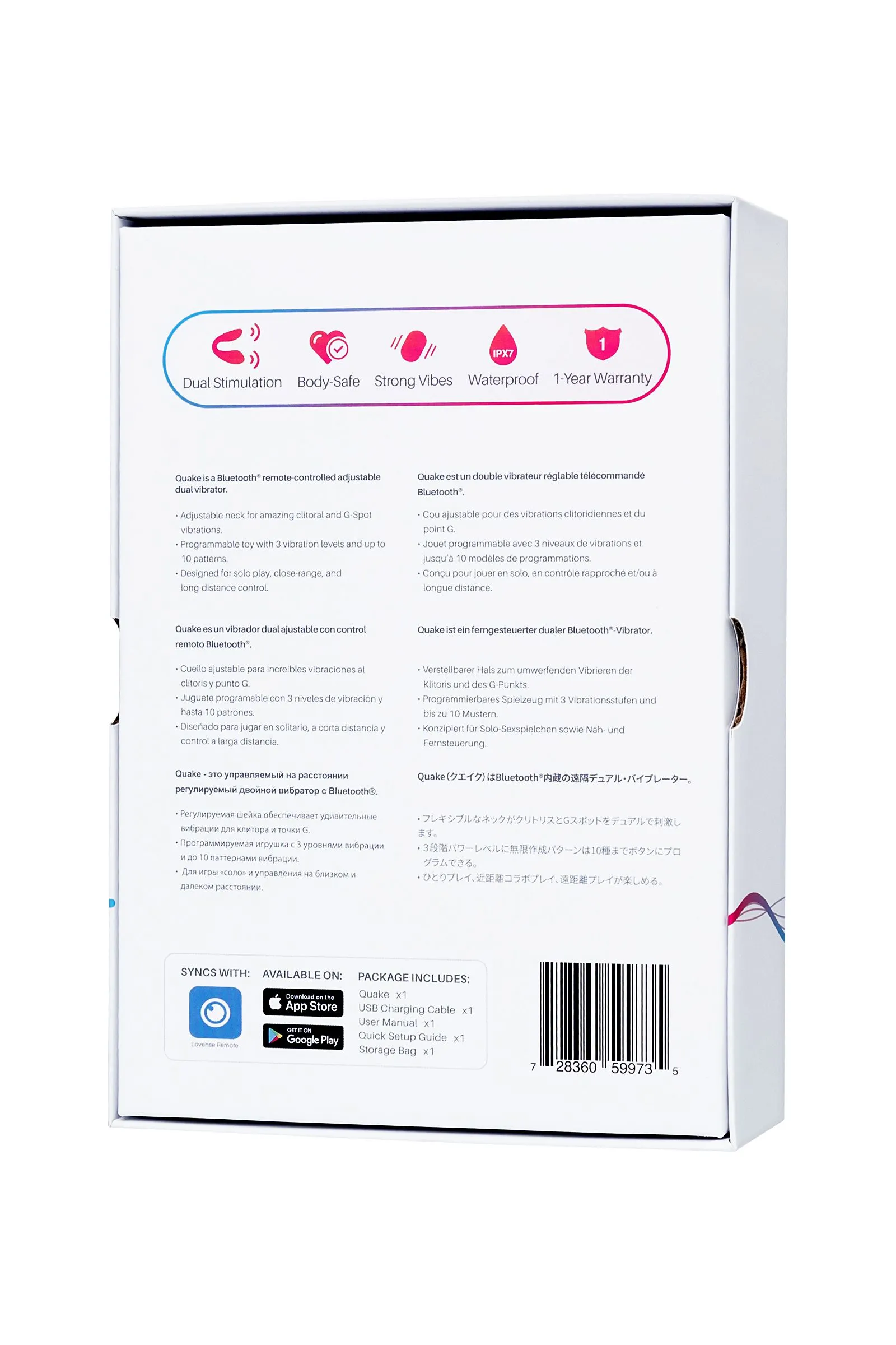 Dolce (ранее Quake) от LOVENSE - это сверхмощная игрушка, которая обеспечивает двойную стимуляцию клитора и зоны G одновременно - регулируемая шейка позволяет вам настроить идеальную форму и обеспечить смешанные интенсивные оргазмы. х 2 Двойной мотор. Двойная мощность. Двойной оргазм - стимуляция зоны G и клитора одновременно Гибкая шейка Регулируемая шейка позволяет подстроить игрушку под любую физиологию, обеспечивая лучший угол соприкосновения с клитором и зоной G. Наслаждайтесь интенсивными клиторальными и вагинальными оргазмами в одно и то же время, исследуя себя, даря себе глубокие ощущения по всему телу. Программируемая функция Настраивайте уровни мощности вибрации по своему вкусу и сохраняйте их для дальнейшего использования. Также запрограммируйте до 10 любимых паттернов! Стабильное подключение Антенна новейшего поколения и чип Bluetooth для любителей игр на большом расстоянии. Многофункциональное приложение позволяет выбрать уровень мощности и разнообразные паттерны и ритмы, соответствующий вашим индивидуальным потребностям. Сильные вибрации Гладкое силиконовое покрытие и сверхсильные вибрации обеспечивают потрясающие оргазмы. 3 уровня мощности 10 паттернов вибрации Водонепроницаемый Работает с приложением Зарядка 70 минут Время работы до 120 минут В режиме ожидания до 240 часов Что в комплекте: Регулируемый Двойной Вибратор с Bluetooth USB Кабель для Подзарядки Инструкция Руководство по Быстрой Настройке Сумка для Хранения Обратите внимание, что вы можете получить упаковку с предыдущим названием продукта “Quake”