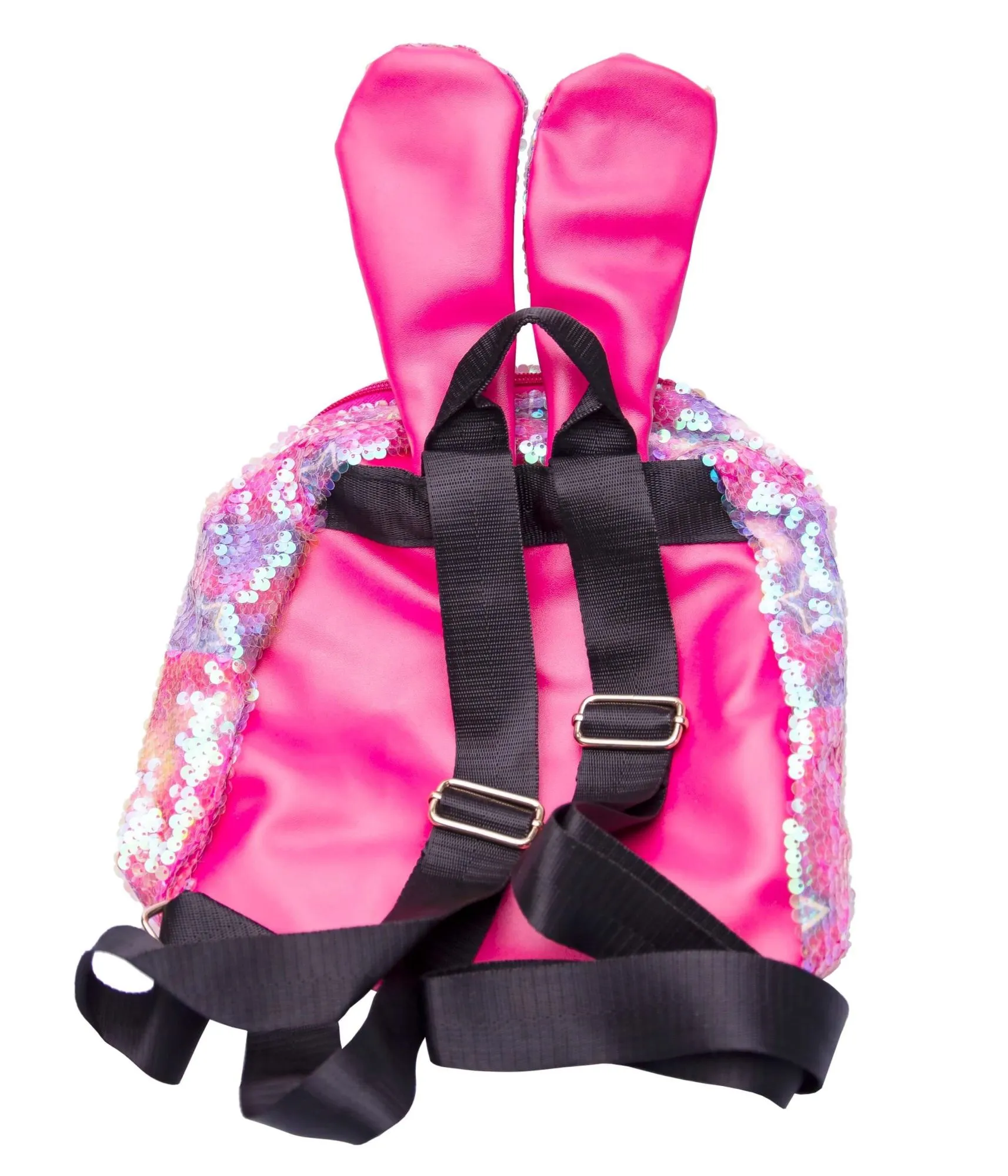 Очаровательный розово-фиолетовый рюкзак с ушками, усыпанный переливающимися пайетками.